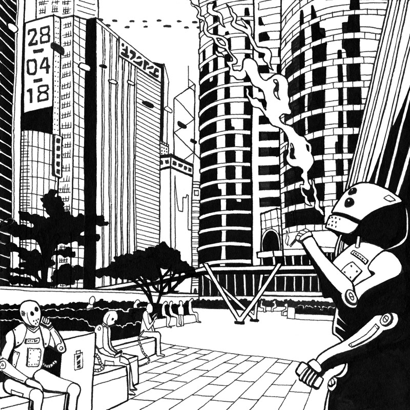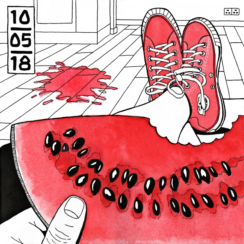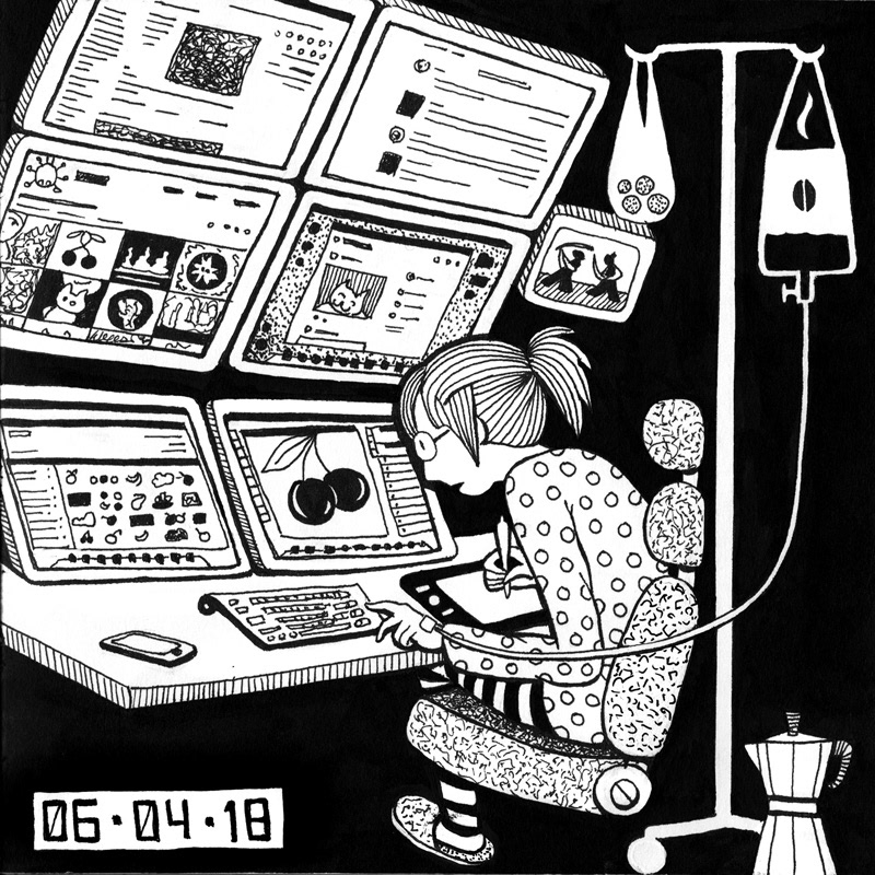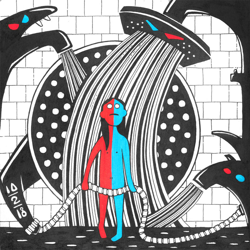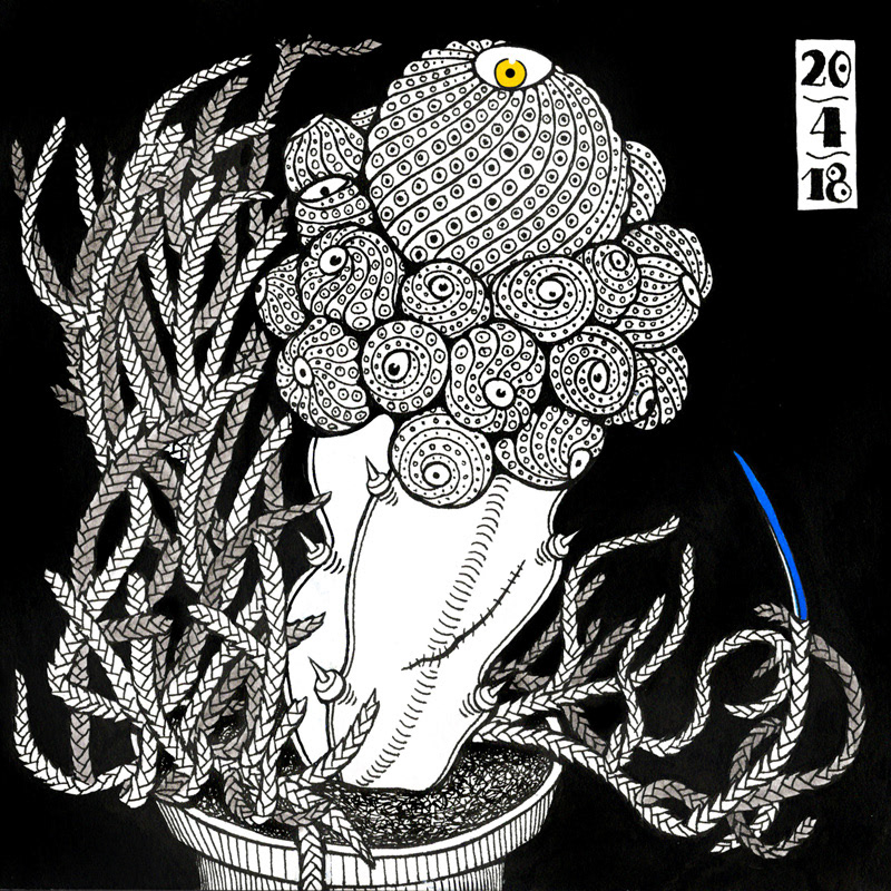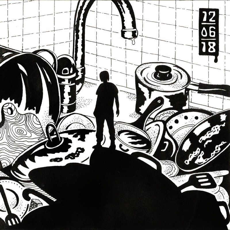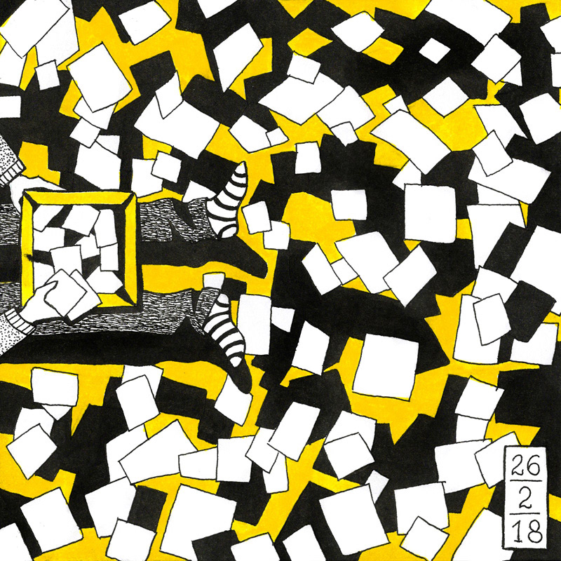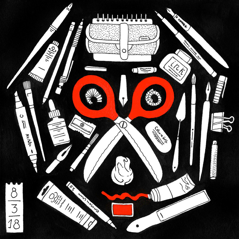События повседневной жизни, перьевая ручка, маркеры и пара капель акварели (2018).