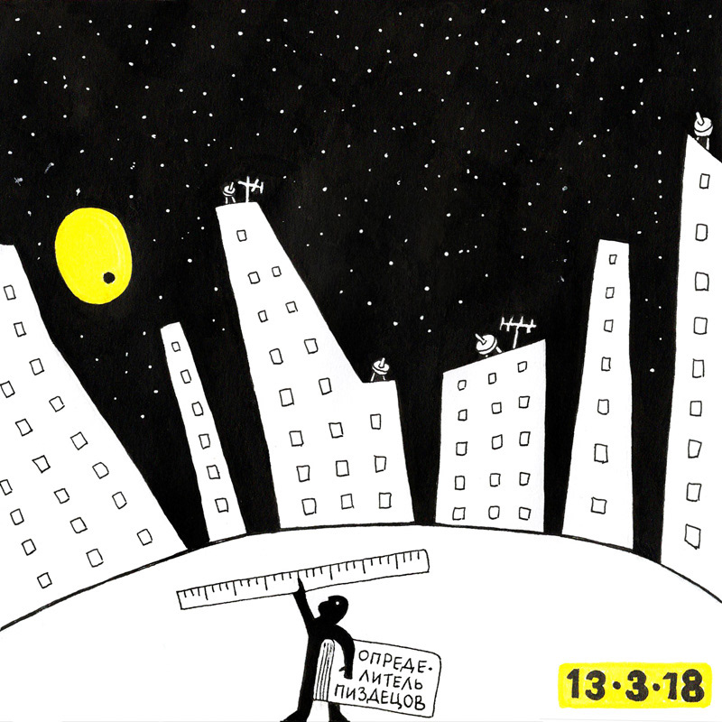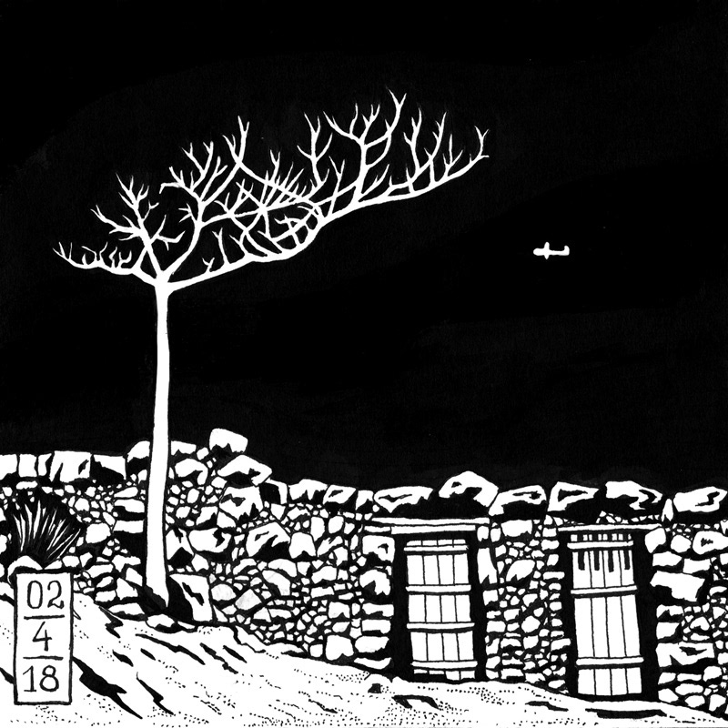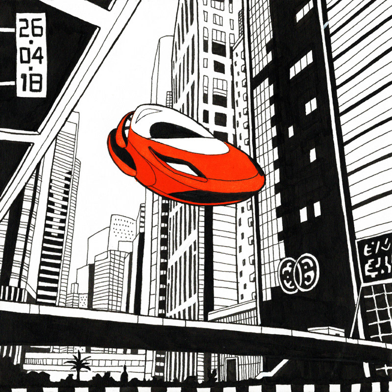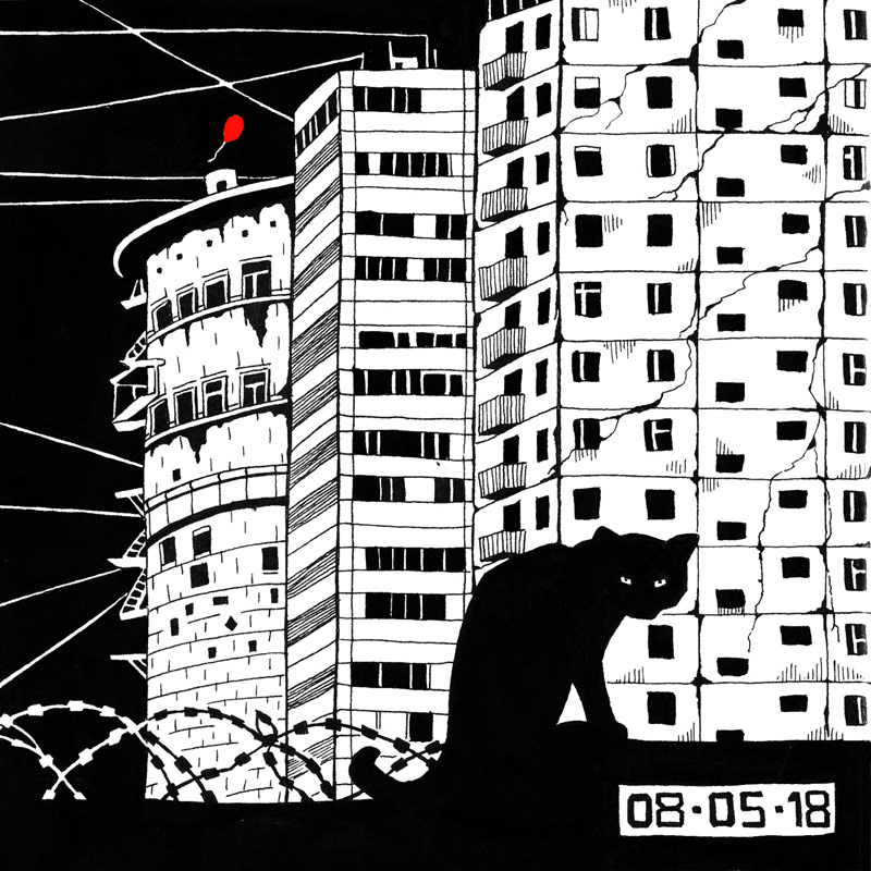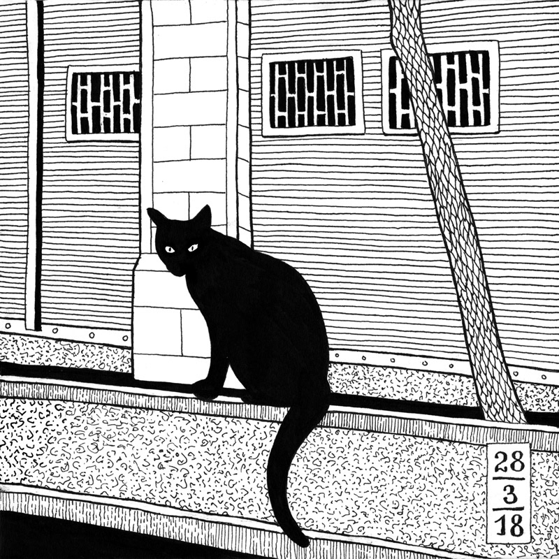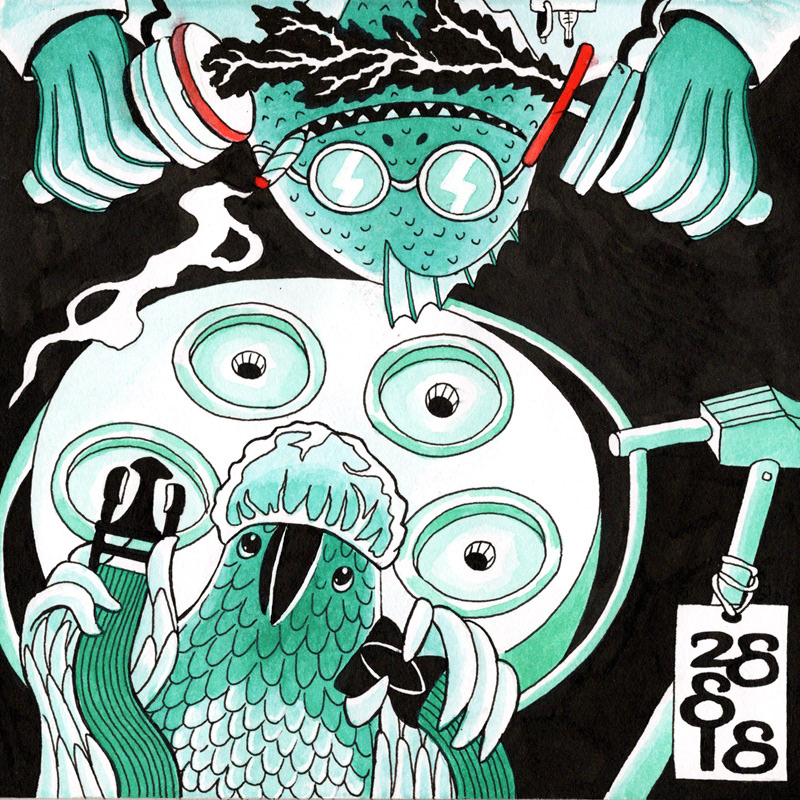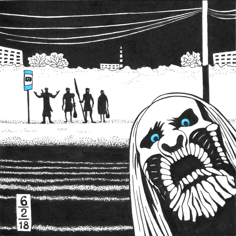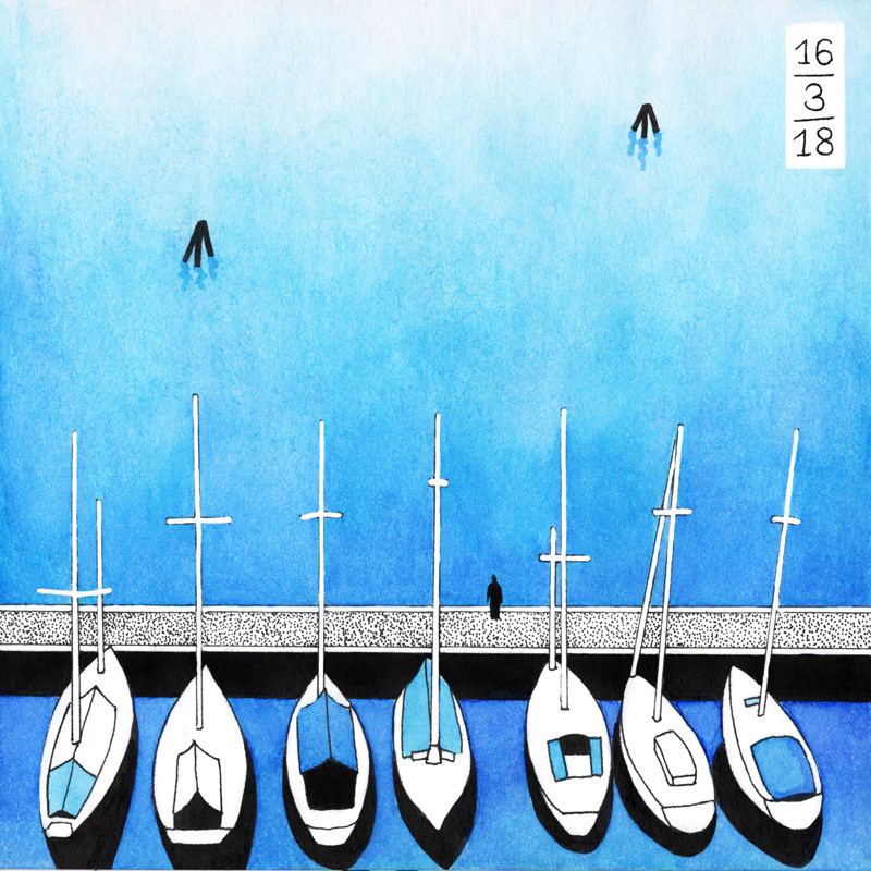 События повседневной жизни, перьевая ручка, маркеры и пара капель акварели (2018).