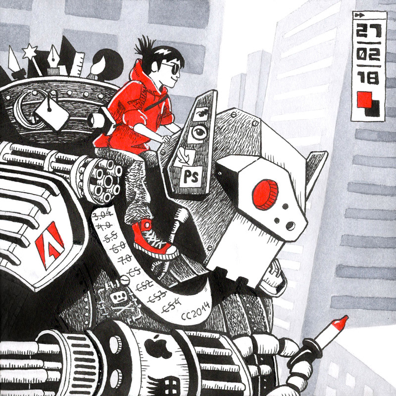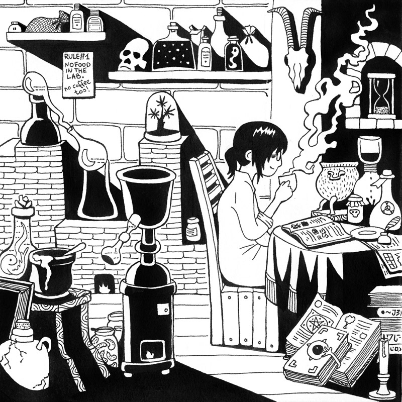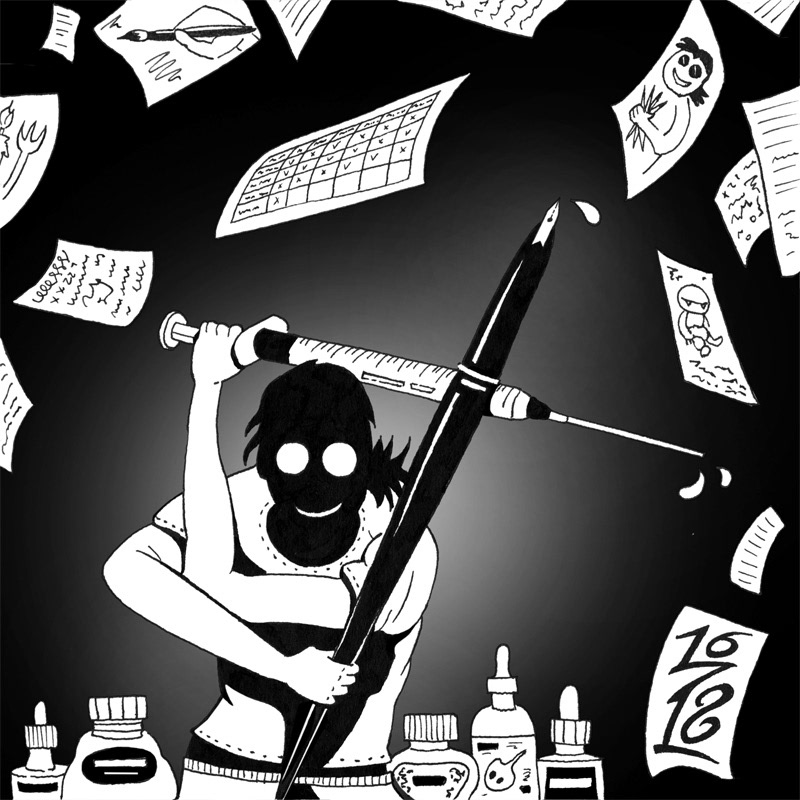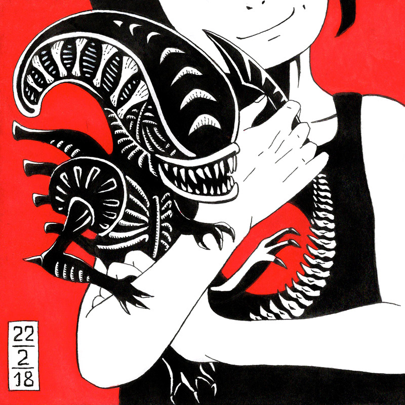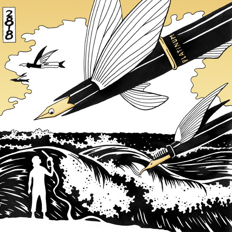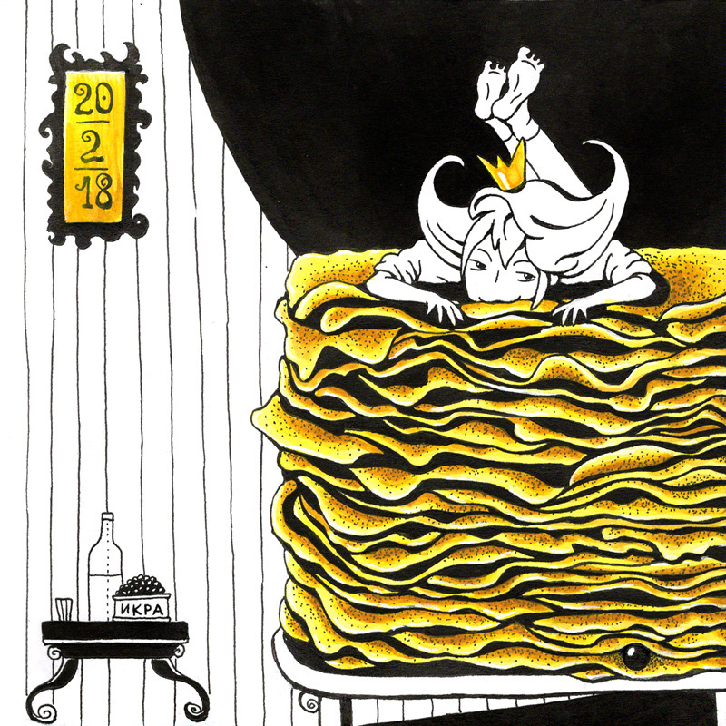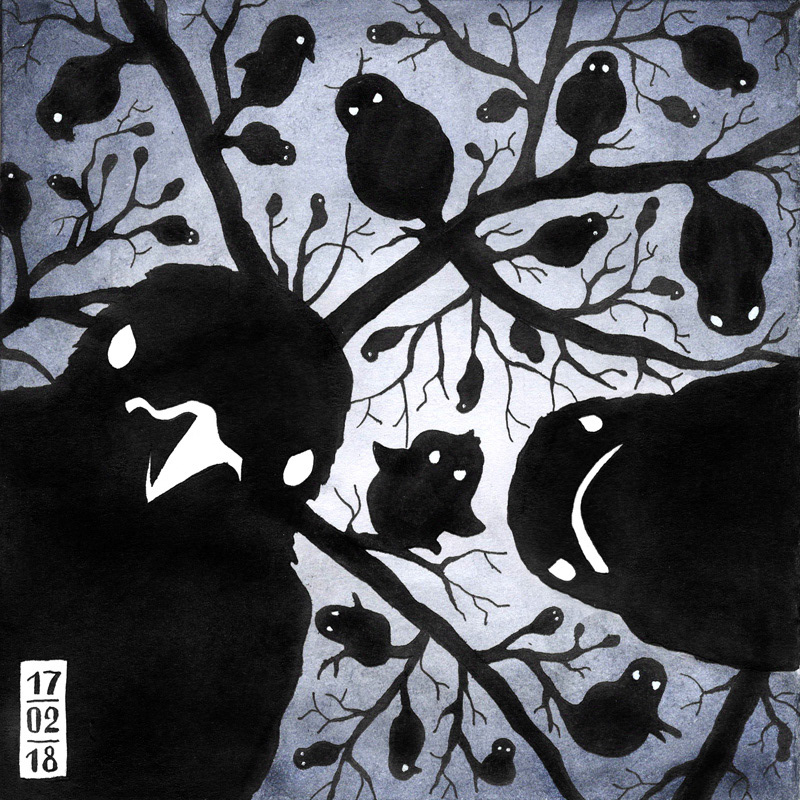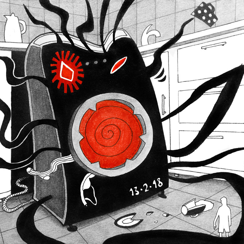 События повседневной жизни, перьевая ручка, маркеры и пара капель акварели (2018).