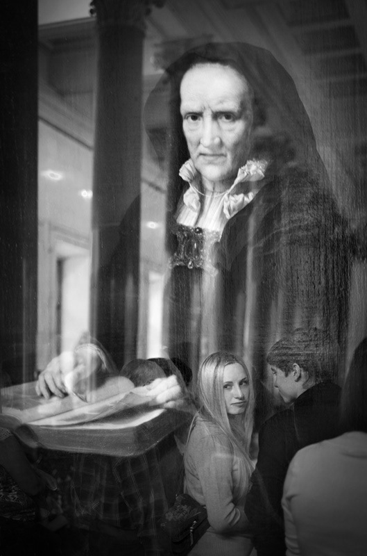 Это серия непостановочных фотографий, в которых случайные люди подловлены в удачные моменты. Я снимала её с 2010 по 2016 гг. в Лувре, Эрмитаже и нескольких других музеях.